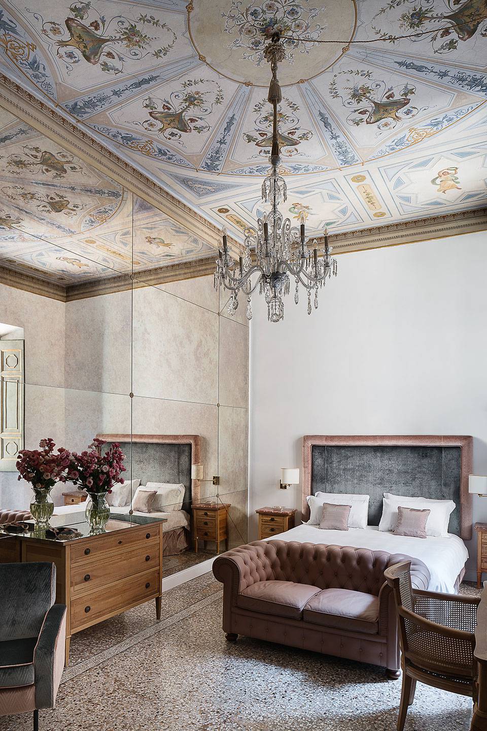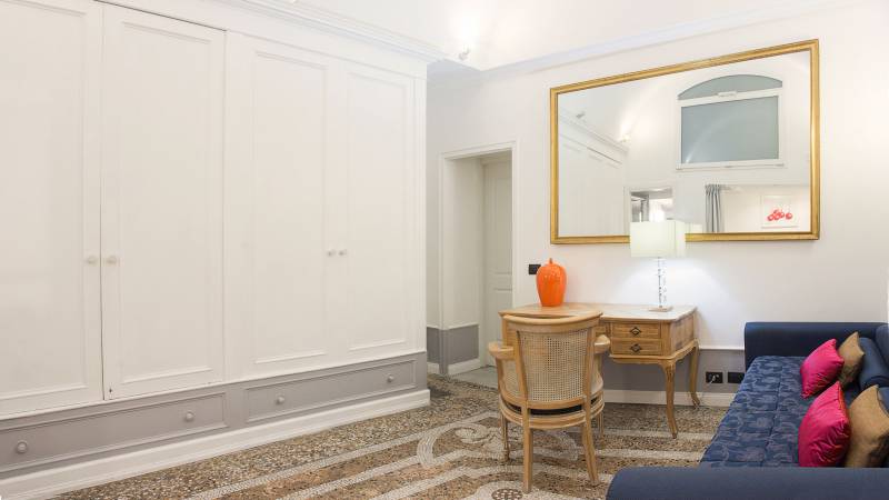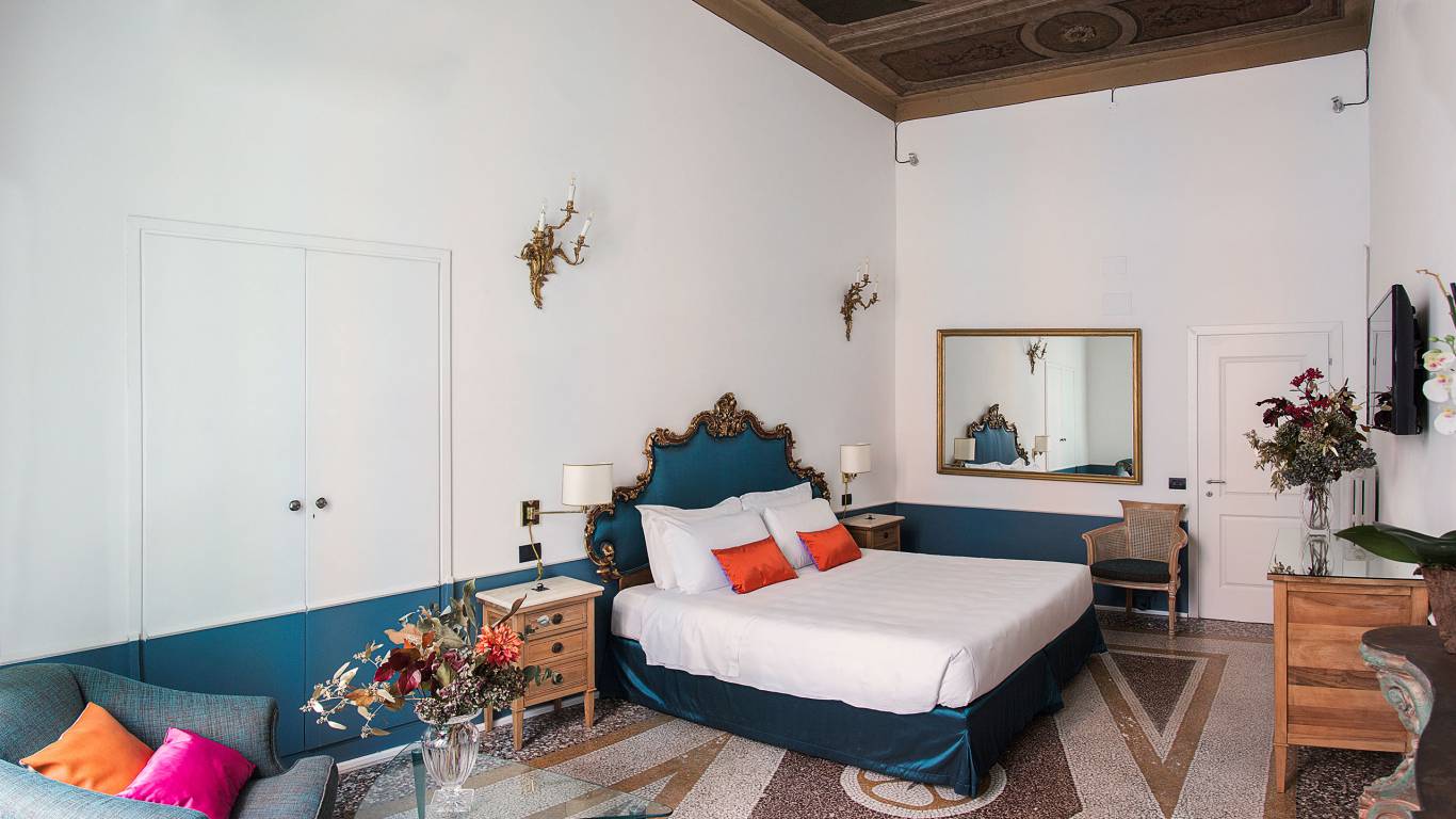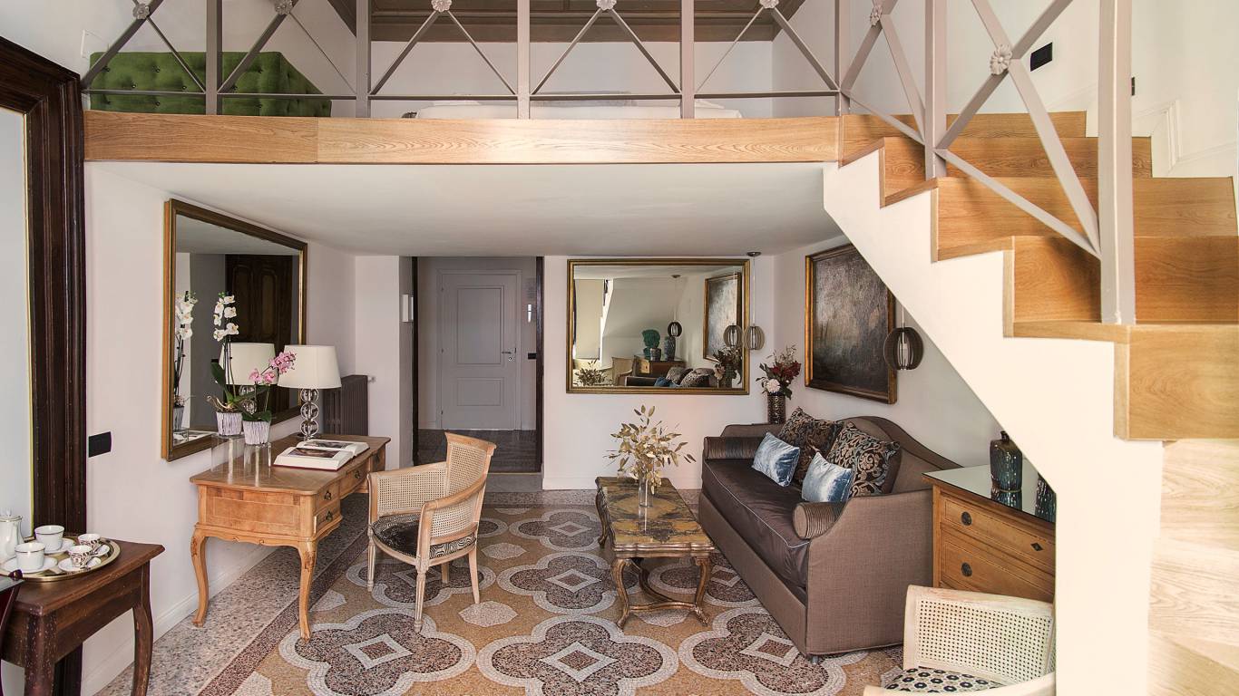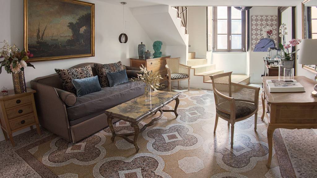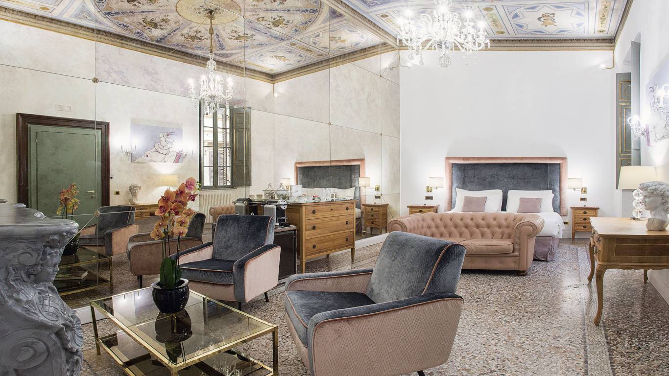 De vijf suites beschikken ieder over een unieke inrichting, de hoge plafonds zijn beschilderd met fresco's en de vloeren zijn bekleed met mozaieken in Venetiaanse stijl.