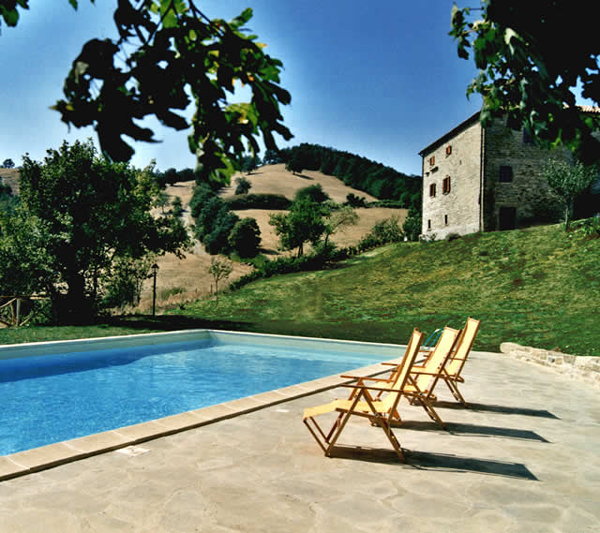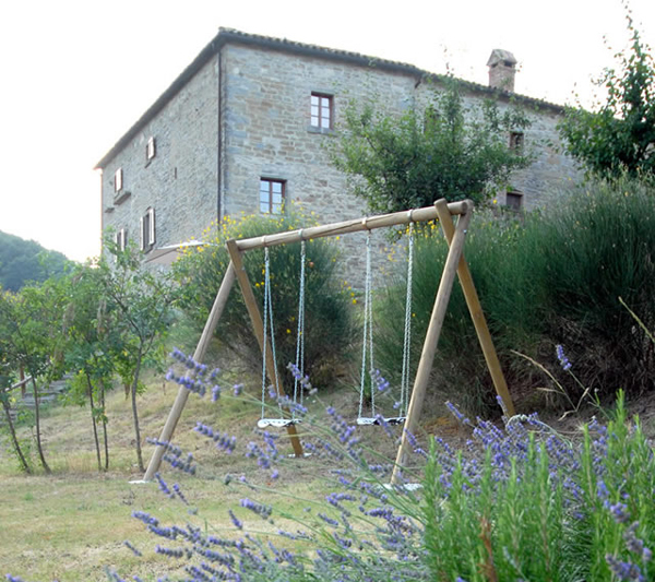 In een prachtige vallei, op twintig kilometer ten zuidwesten van Urbania, bevinden zich drie ruime appartementen in een voormalige boerenwoning. Je bereikt het domein via een onverharde weg.