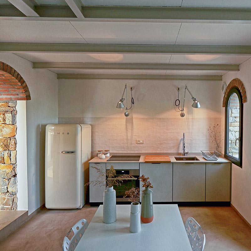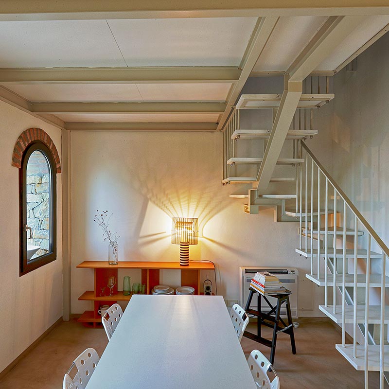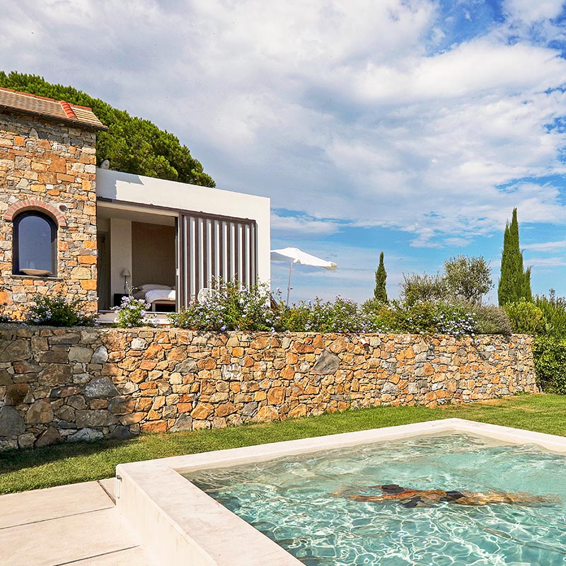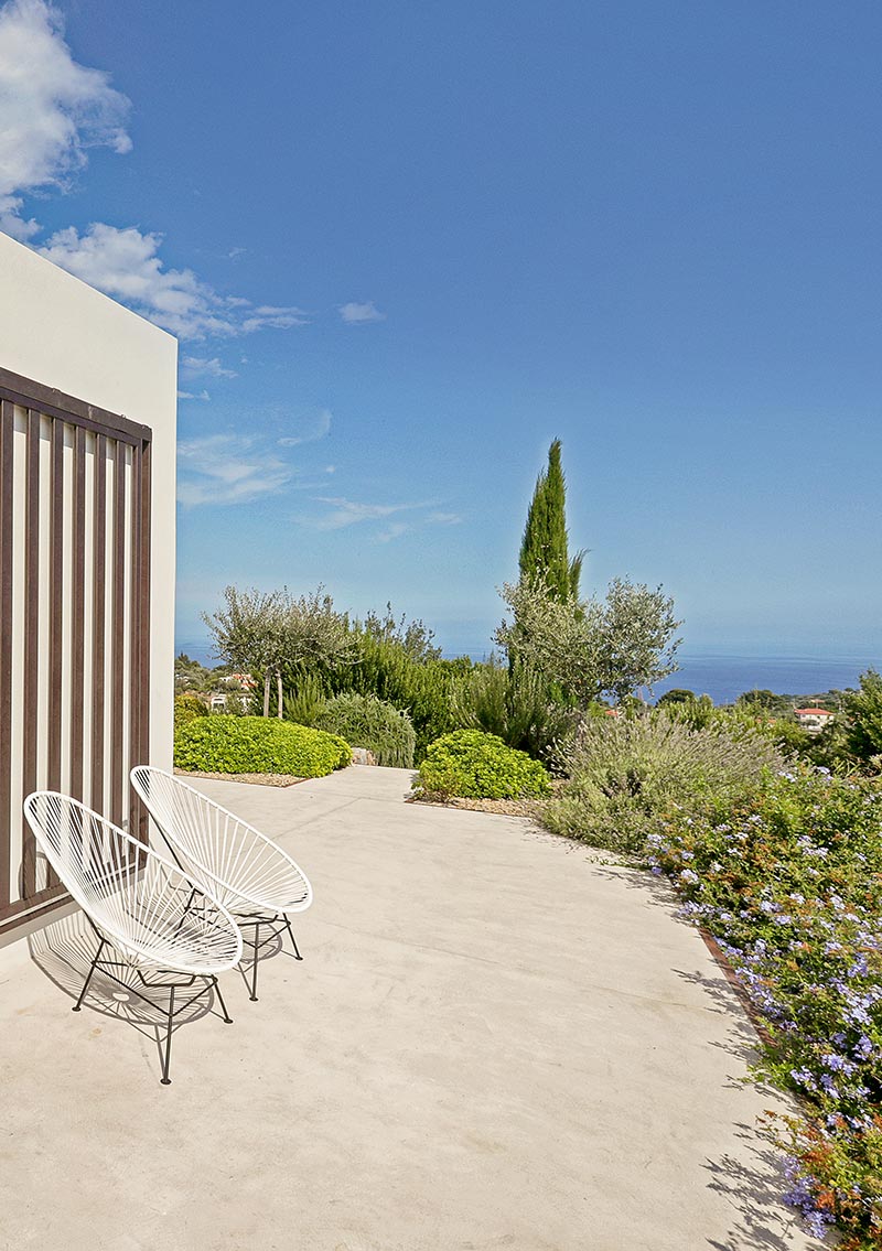 In de met zorg aangelegde tuin ligt een klein zwembad. Het interieur is sober en smaakvol.