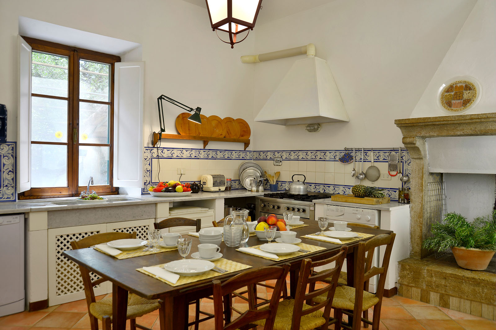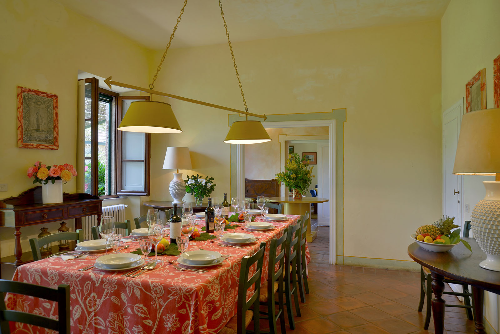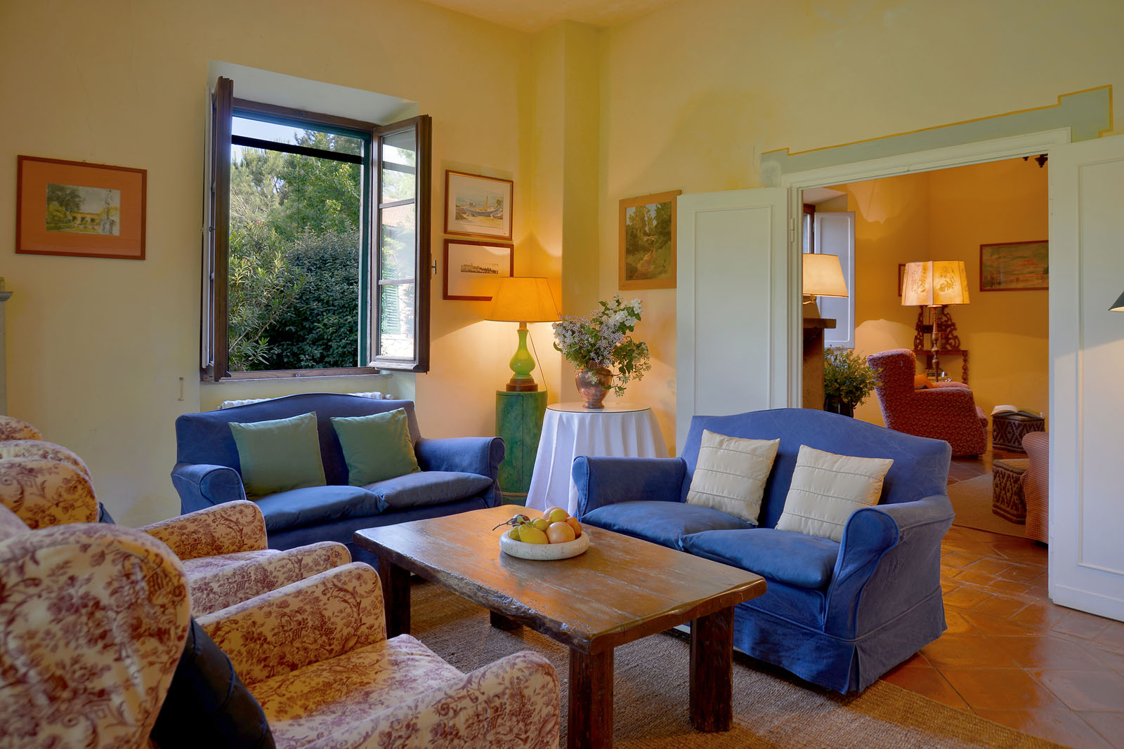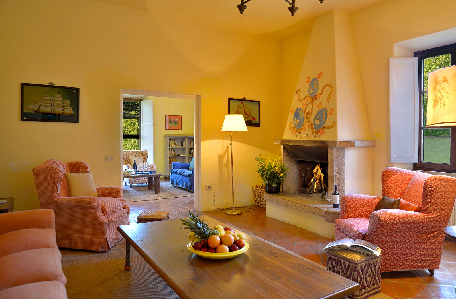 Op de begane grond heb je de beschikking over twee woonkamers - waarvan één met open haard-, een eetkamer en een keuken met open haard. De openslaande deuren geven toegang tot het overdekte terras en de tuin.