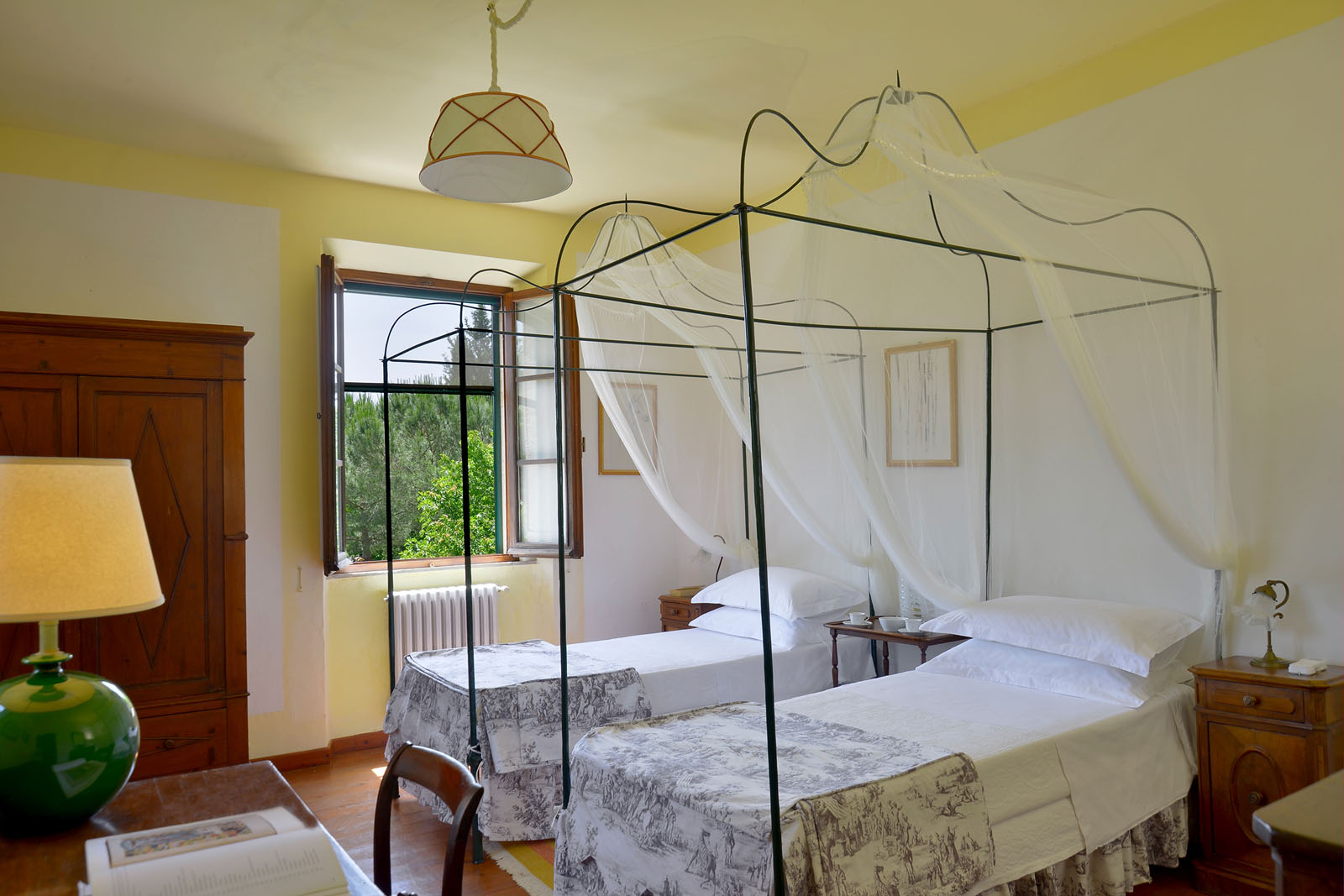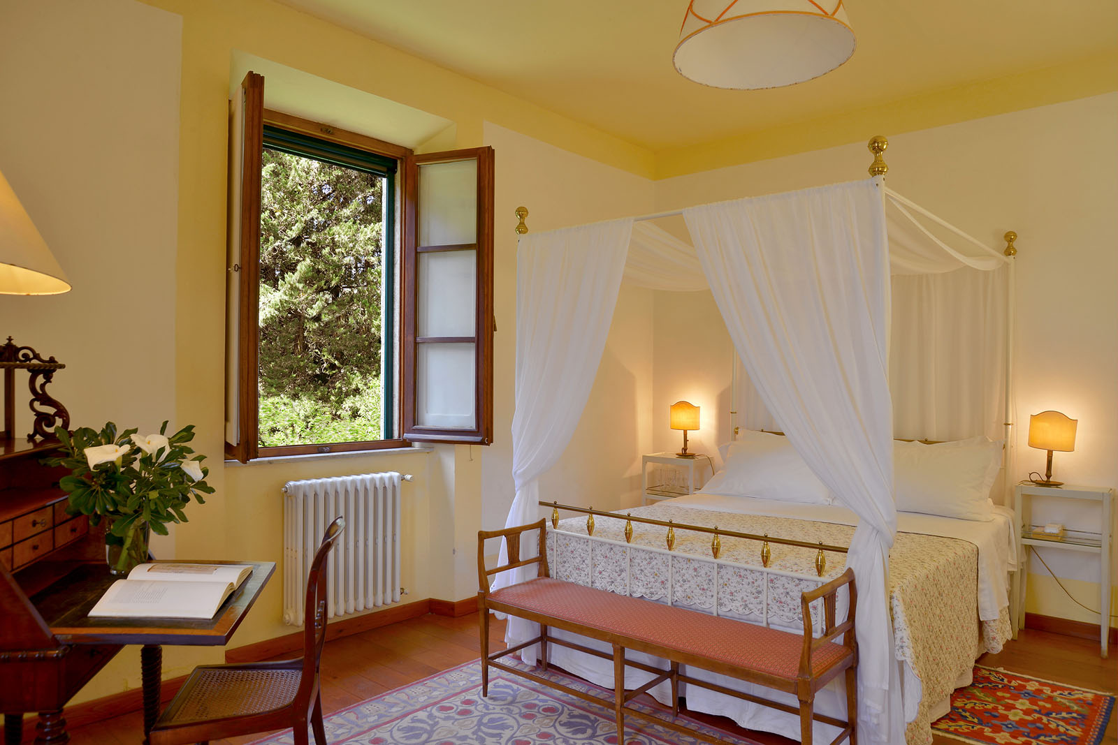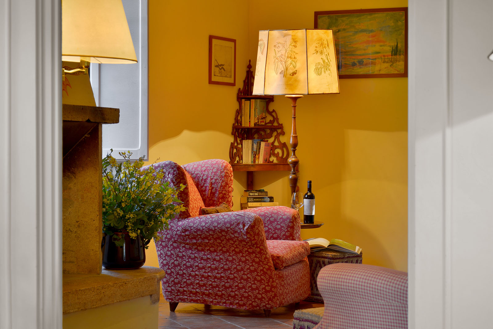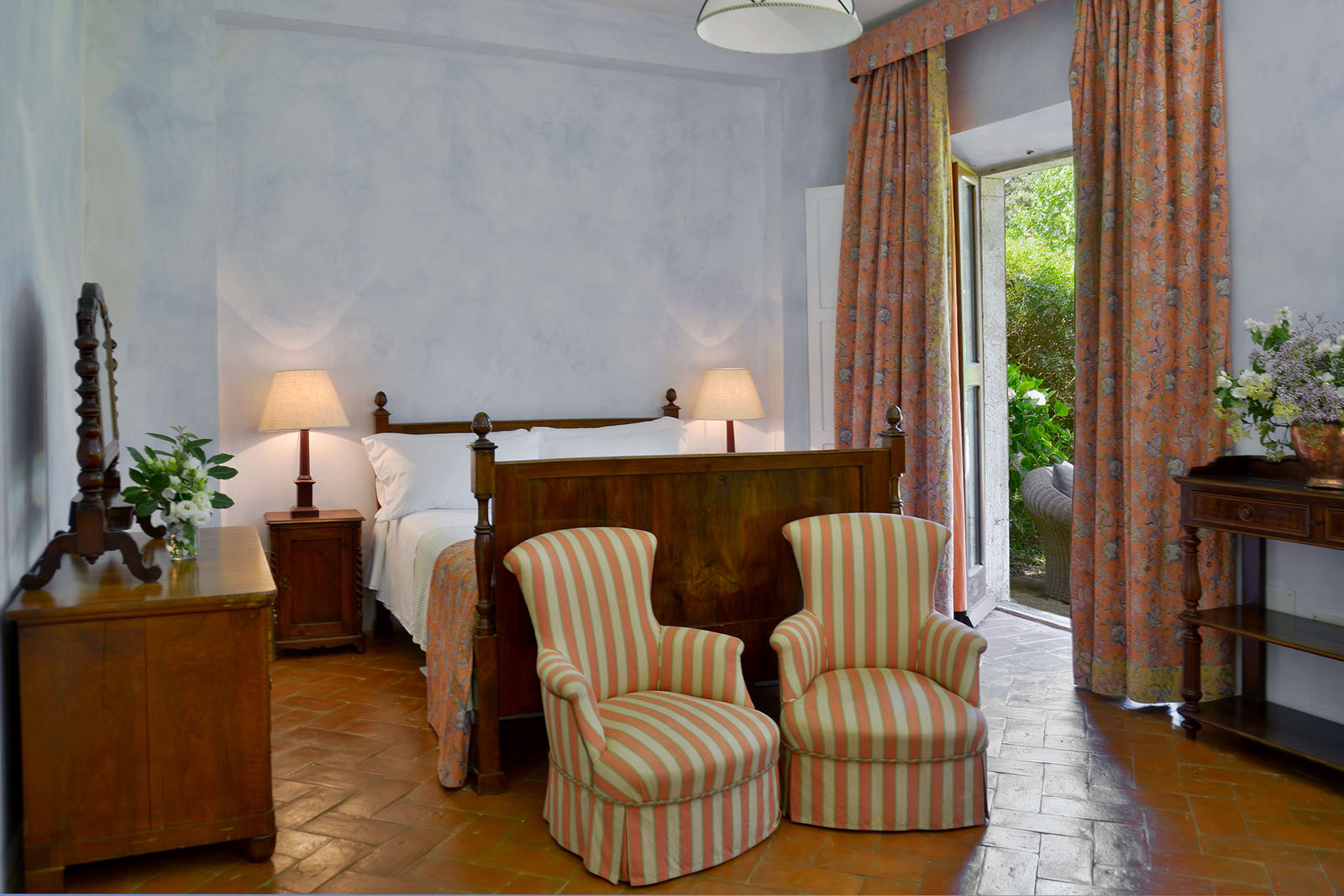 Op de begane grond heb je de beschikking over twee woonkamers - waarvan één met open haard-, een eetkamer en een keuken met open haard. De openslaande deuren geven toegang tot het overdekte terras en de tuin.