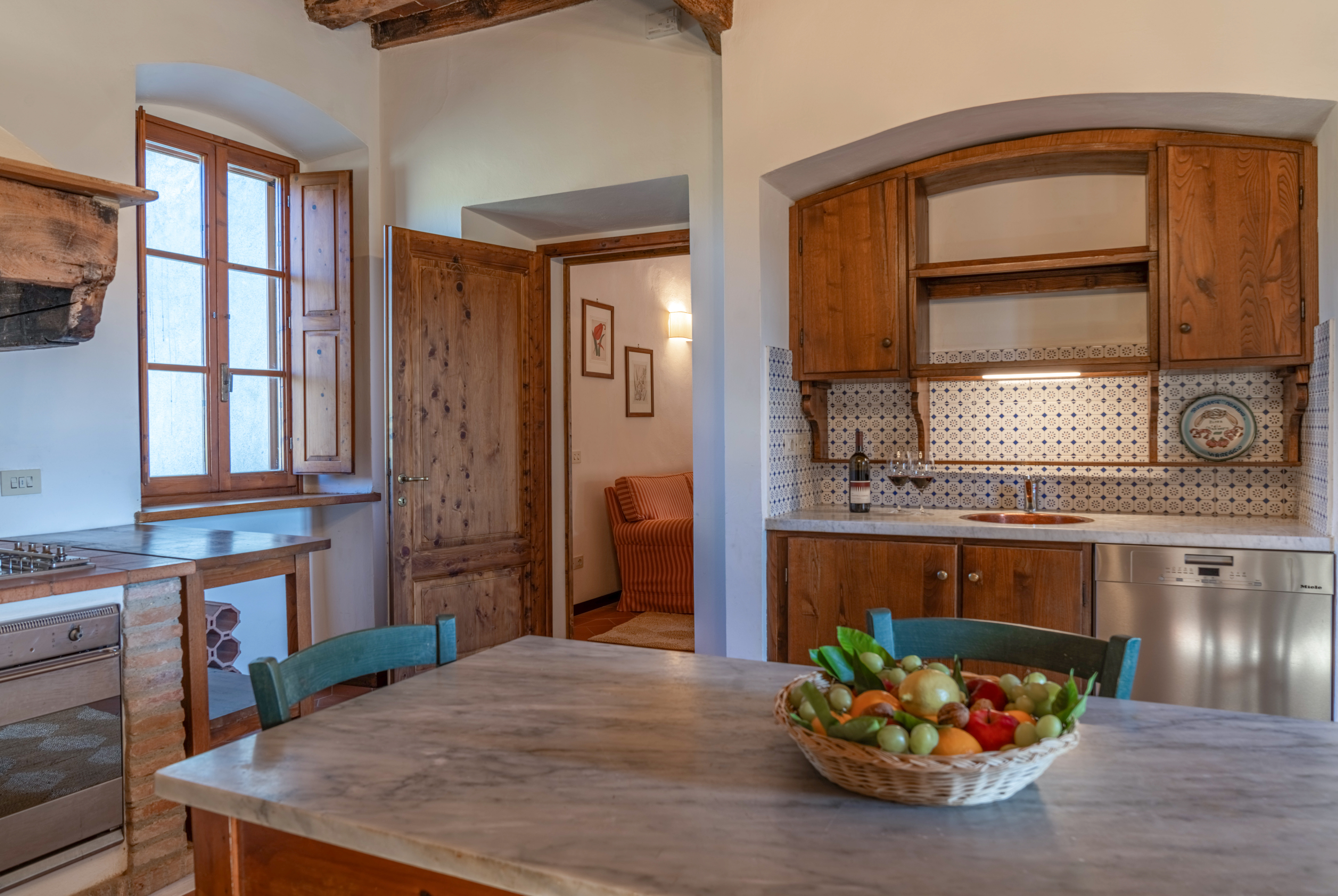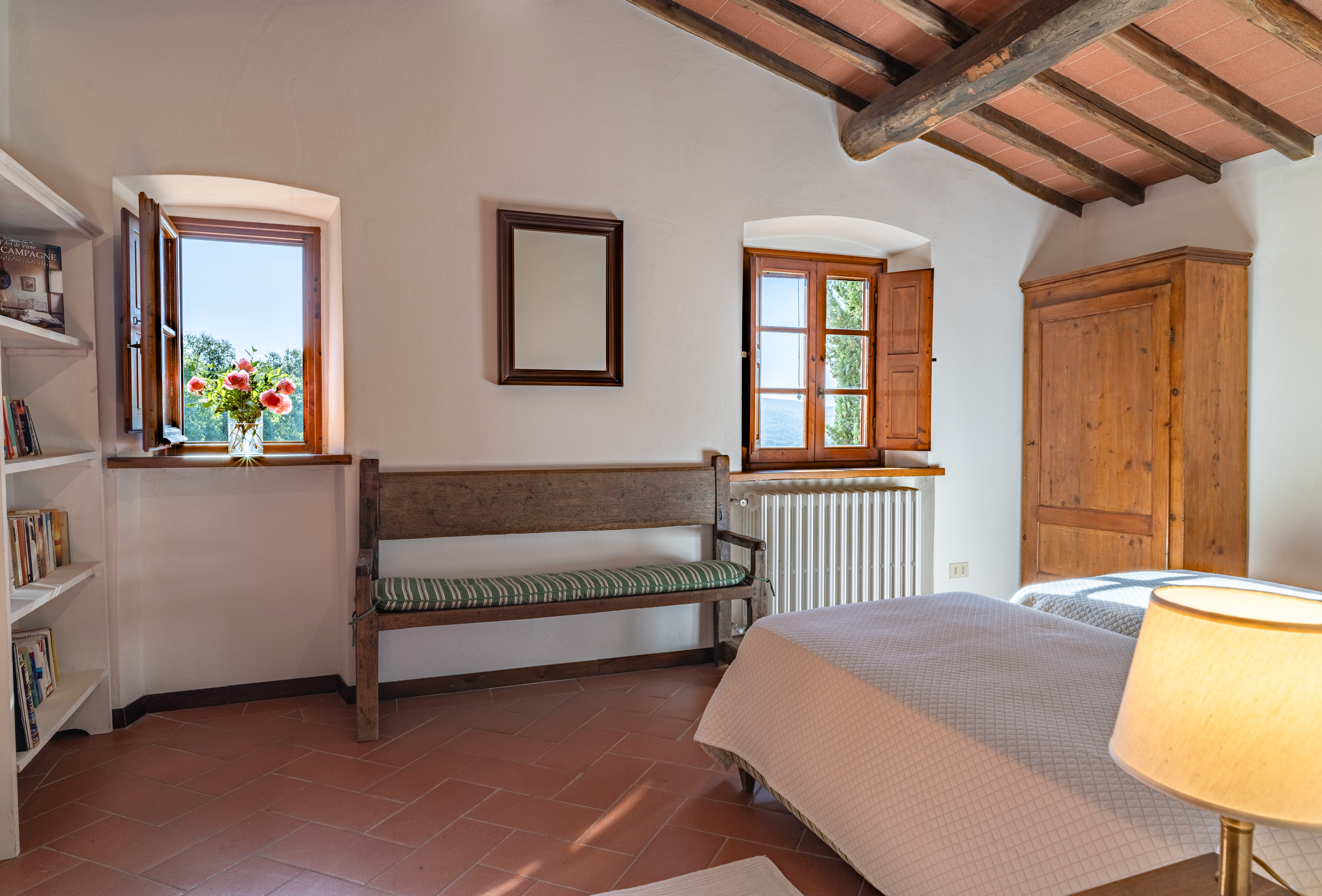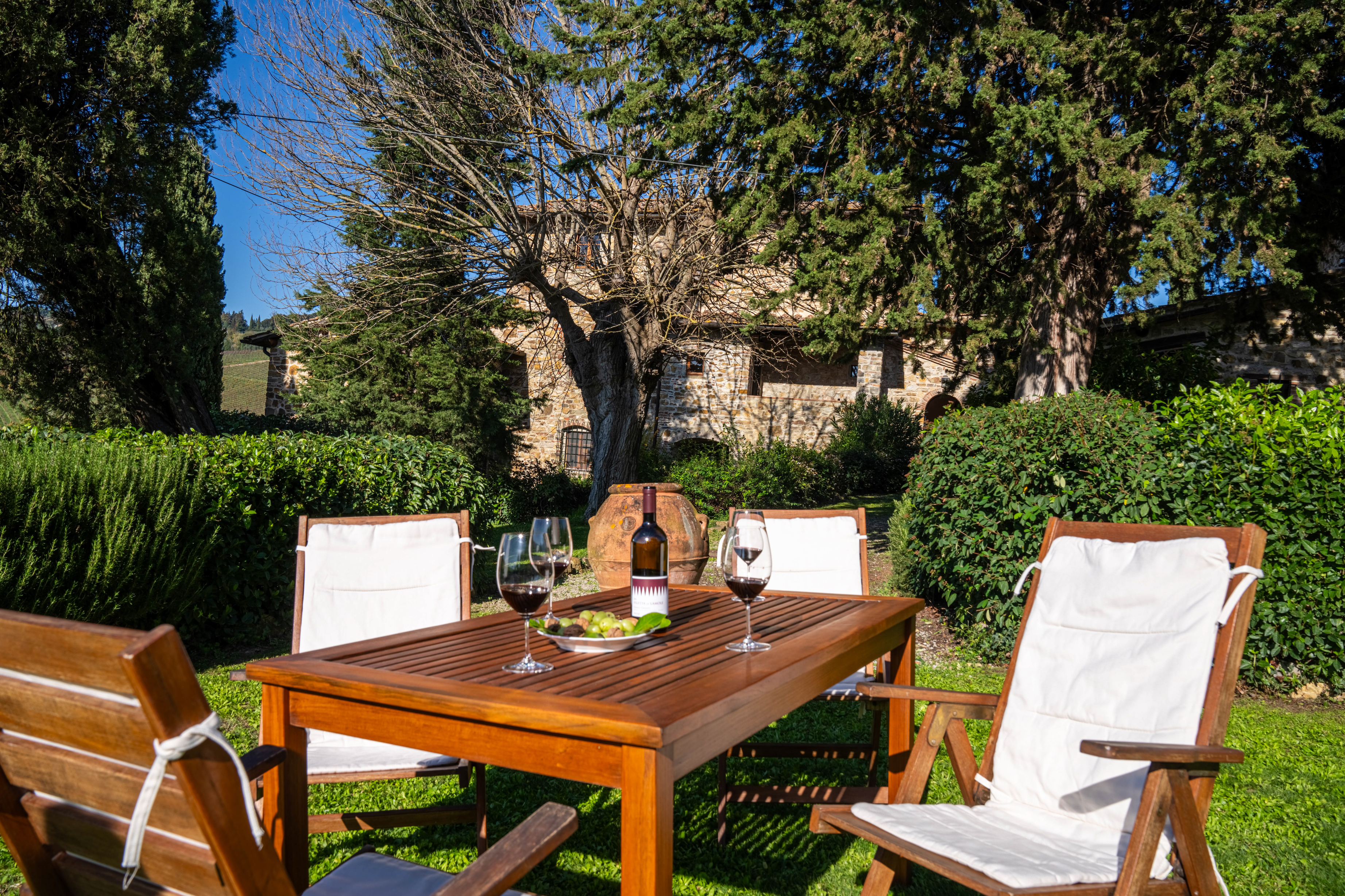 Temidden van de wijngaarden en op één van de mooiste locaties in de Chianti Classico ligt dit vierpersoons appartement dat deel uitmaakt van een kleine borgo met zwembad.
