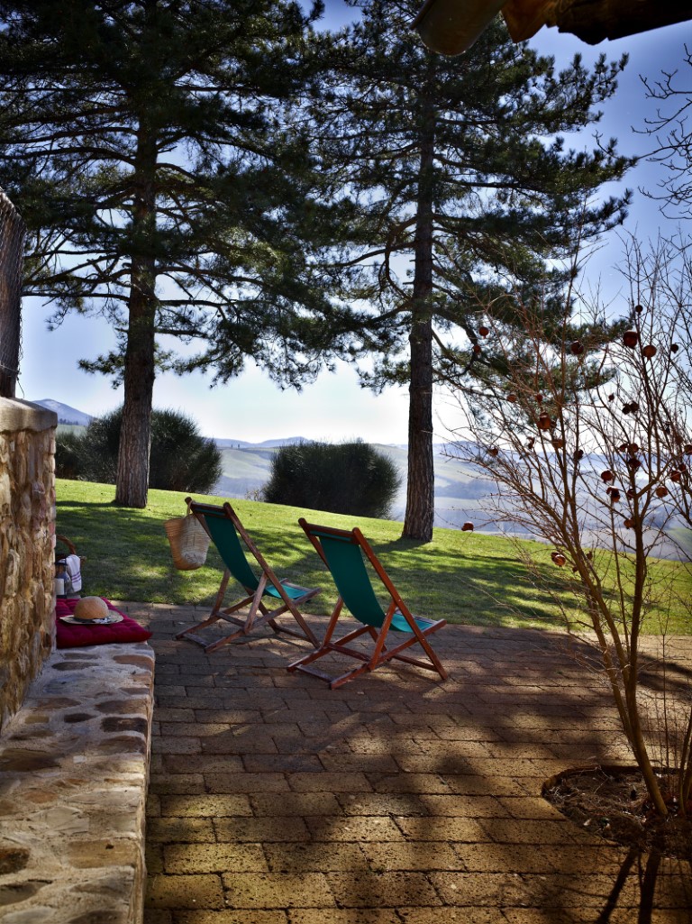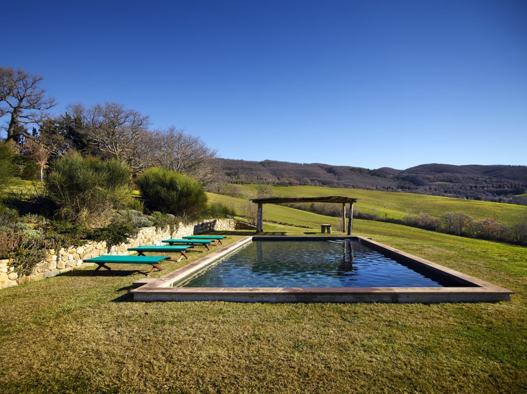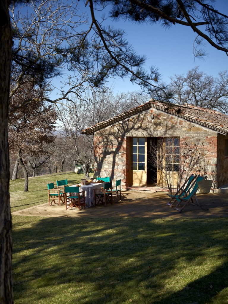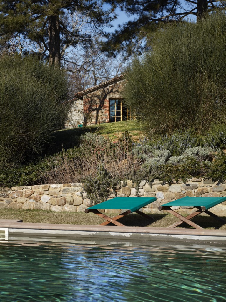 Buiten vind je een terras voor een diner 'al fresco'. Iets lager ligt het zwembad dat gedeeld wordt met de eigenares van het landgoed.