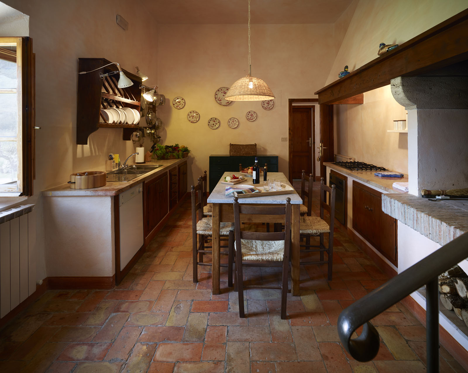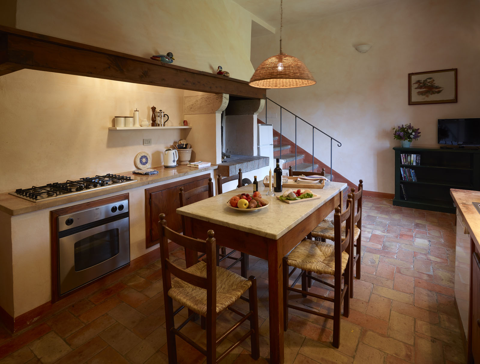 Via een buitentrap bereik je het appartement dat beschikt over een authentieke Toscaanse keuken. Een aantal treden leidt naar de verdieping waar de woonkamer, een tweepersoons slaapkamer met badkamer en suite plus een tweede tweepersoons slaapkamer met aparte badkamer zijn gesitueerd.