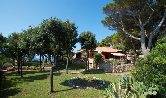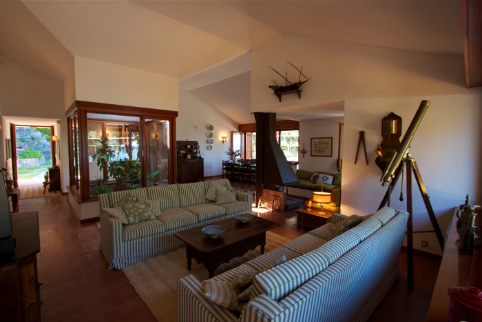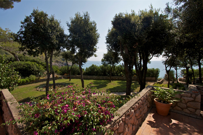 Het huis wordt omgeven door een grote terrasvormig aangelegde tuin waarin oleanders, pijnbomen, eiken en agaves groeien. Vanuit de tuin leiden twee trappen naar het lager gelegen strand.