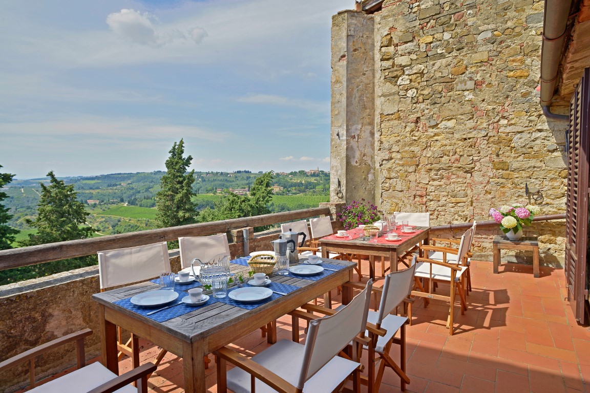 Het beste van twee werelden: een historische villa met fenomenaal uitzicht op het Toscaanse landschap, gelegen binnen de stadsmuren en op loopafstand van een restaurant, een wijnbar en wat winkeltjes. Uitkijkend vanaf het grote terras zie je over de heuvels begroeid met wijngaarden en olijfbomen in de verte San Gimignano liggen.