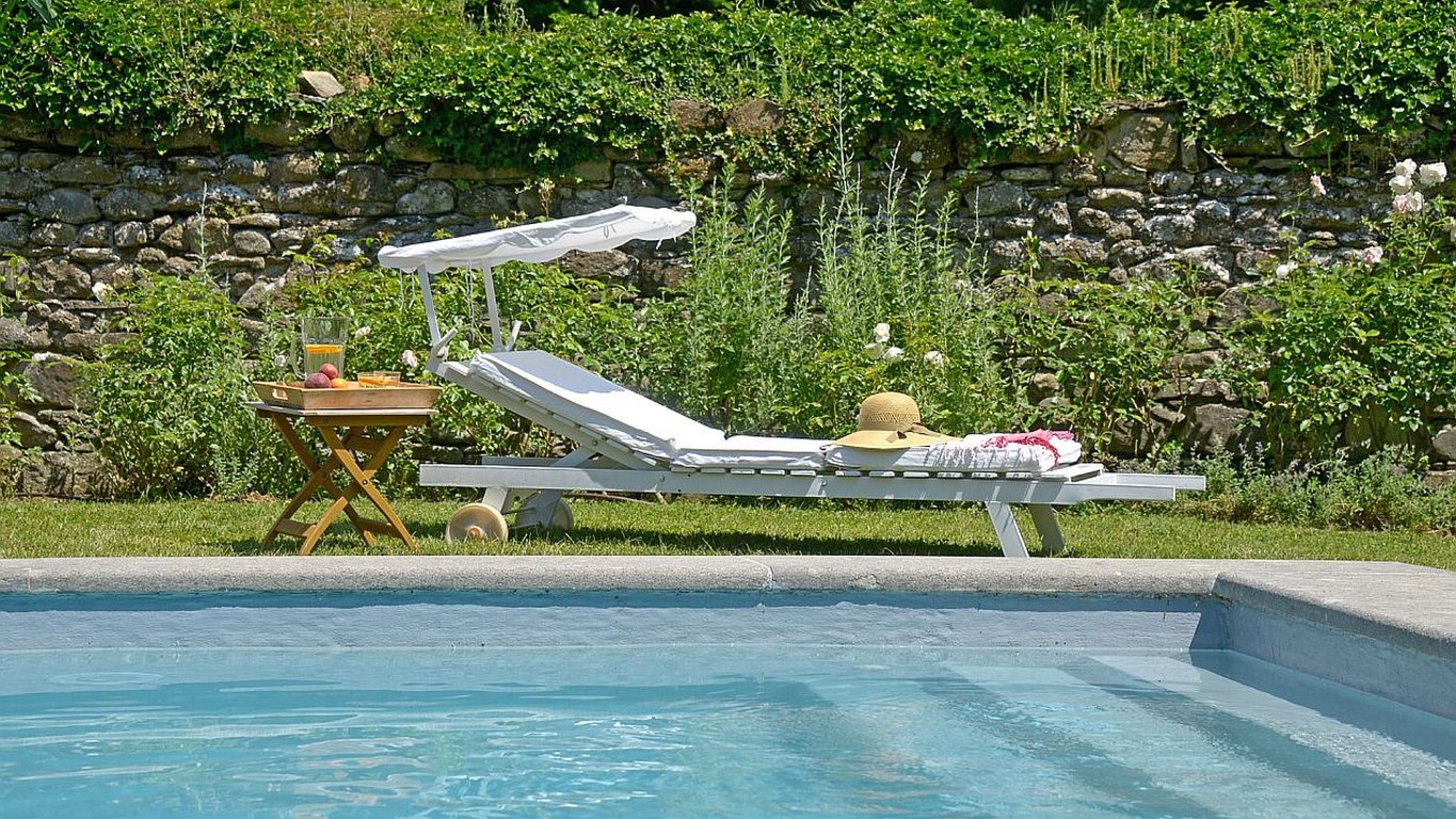In de tuin ligt een prachtig zwembad omgeven door ligstoelen.